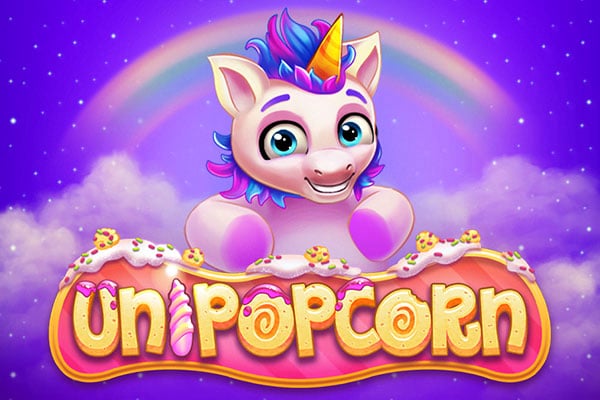 It features a cute, animated unicorn with a colorful mane and a cheerful expression, set against a vibrant, rainbow-filled sky. The game likely involves playful, whimsical themes centered around fun and fantasy, possibly including elements related to popcorn and snacks, creating a lively and engaging experience.