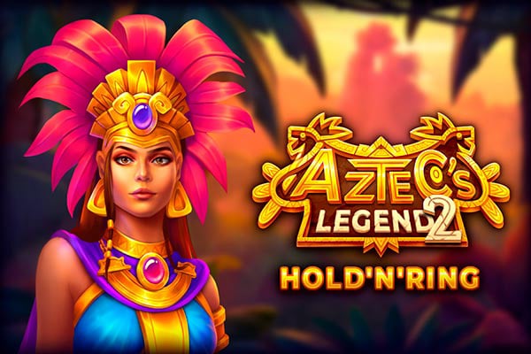 It features a striking image of an Aztec queen or goddess adorned with vibrant pink feathers, gold jewelry, and traditional motifs, set against a lush, jungle-like background with warm, sunset hues. The game likely involves themes of ancient Aztec mythology, treasure hunting, and possibly a hold 'n' ring mechanic, emphasizing exciting, adventure-themed gameplay.