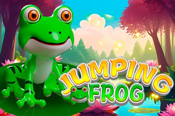 It features a cute, animated frog with a cheerful expression, set against a colorful, nature-inspired background with trees and flowers. The game likely involves jumping or bouncing mechanics, emphasizing fun and playful gameplay centered around frogs.